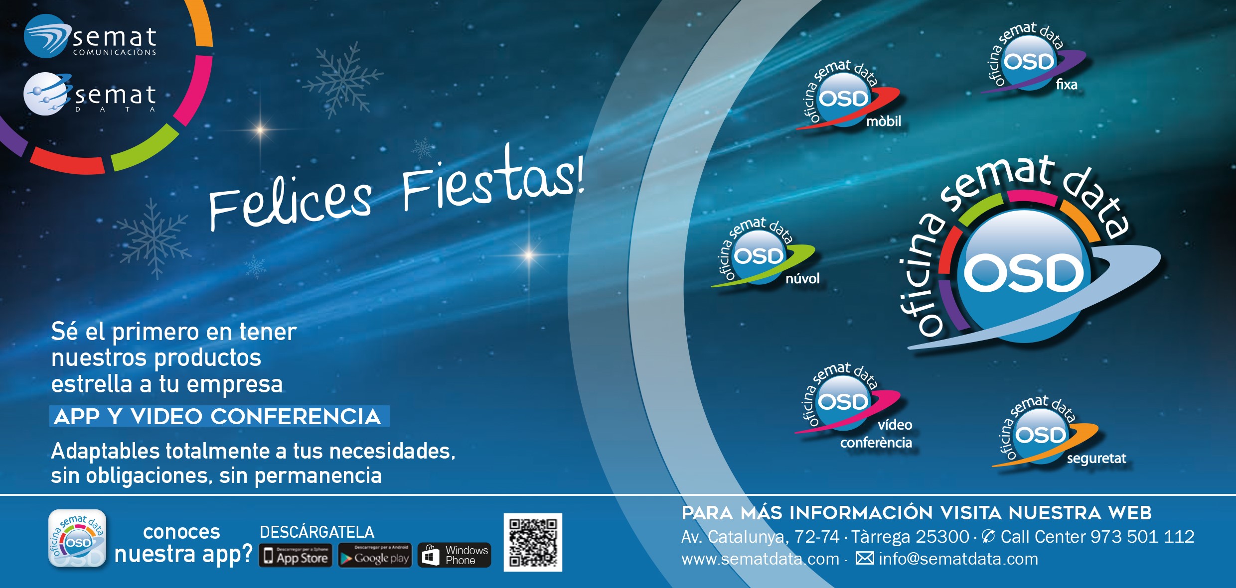 Todo el equipo de Semat os queremos desear unas felices fiestas y un feliz año nuevo 2016. Este año que comienza seguro estará lleno de novedades y alegrías, y nosotros os ayudaremos a conseguirlo. Teneis a vuestra disposición todo nuestro abanico de productos OSD que os ayudará a que vuestro negocio sea más próspero y más rentable.